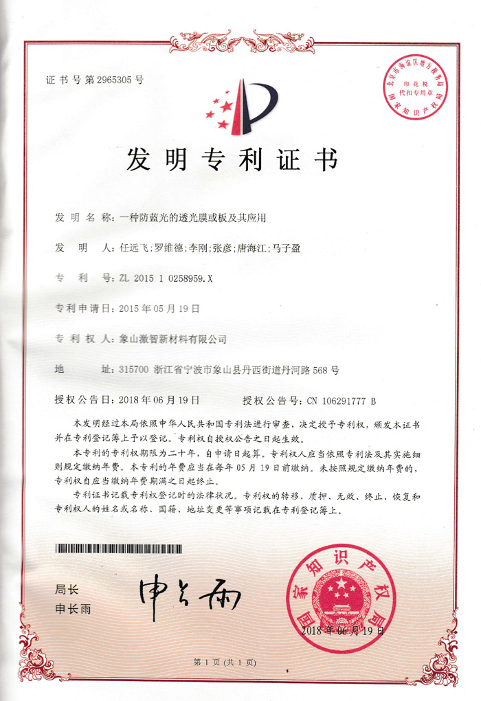 一种防蓝光的透光膜或板及其应用