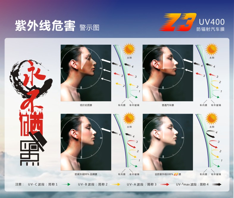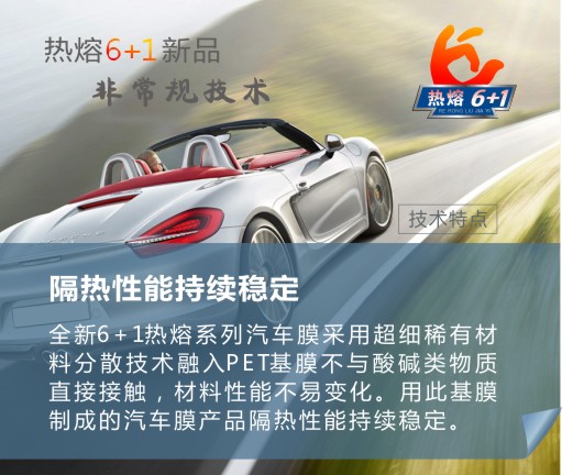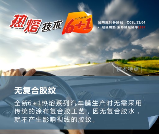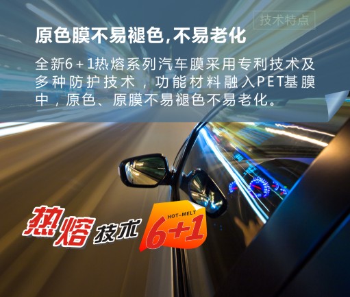 紫光公司最新生产的窗膜采用全新“6+1”专利技术,改变了传统窗膜的制造工艺,引领窗膜技术革命,该系列产品不起泡、高隔热、不氧化发黑、无胶痕、低反光,不影响GPS、ETC、手机等通信、安全防爆。特殊专利功能使产品防紫外线程度达到UV400全防紫外线,有效保护室内家具、地板,保护皮肤不被晒黑;保护眼睛晶状体,预防白内障。